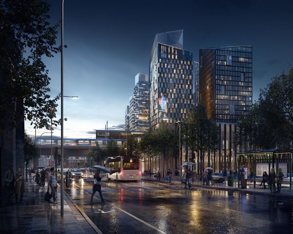 Storstädernas tillväxt och samhällets elektrifiering gör att vi måste prioritera hur vi ska använda elen bäst. Visionsbild för Region City med Älvtornet och Jubileumstornet sett från Nordstans nordsida.