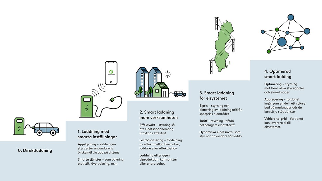 Här beskriver vi "stegen" i trappan för smart laddning och vad de innebär.