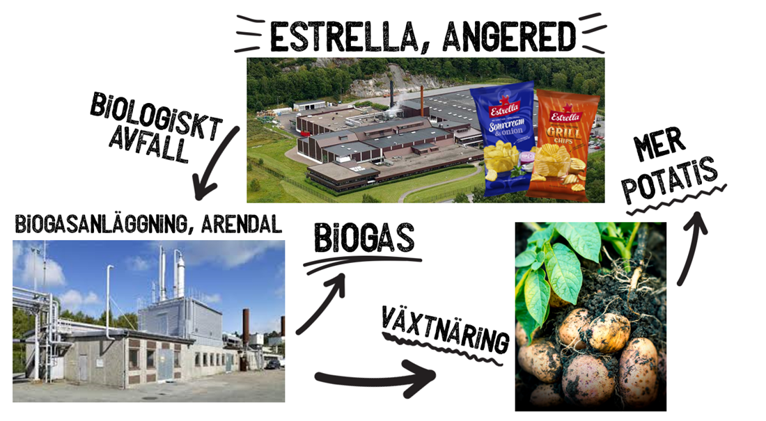 Göteborg Energi och Estrella har samarbetat sedan snacksföretaget flyttade till Angered år 1983. Under 2008 köpte de in en panna för ossil naturgas för att driva sin chipsproduktion, men först efter nio år fanns det kapacitet på marknaden att kunna köpa biogas för Estrellas behov. Sedan 2017 drivs anläggningens samtliga pannor för chipsproduktion av biogas.