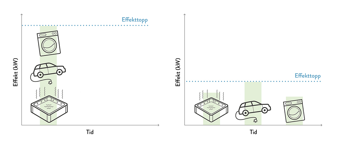 Använder du flera saker samtidigt – till exempel laddar elbilen, värmer upp ditt spabad och tvättar, så ökar din effekt, och din effektavgift blir högre. Sprider du istället ut elanvändningen minskar effekten, och din effektavgift blir lägre.